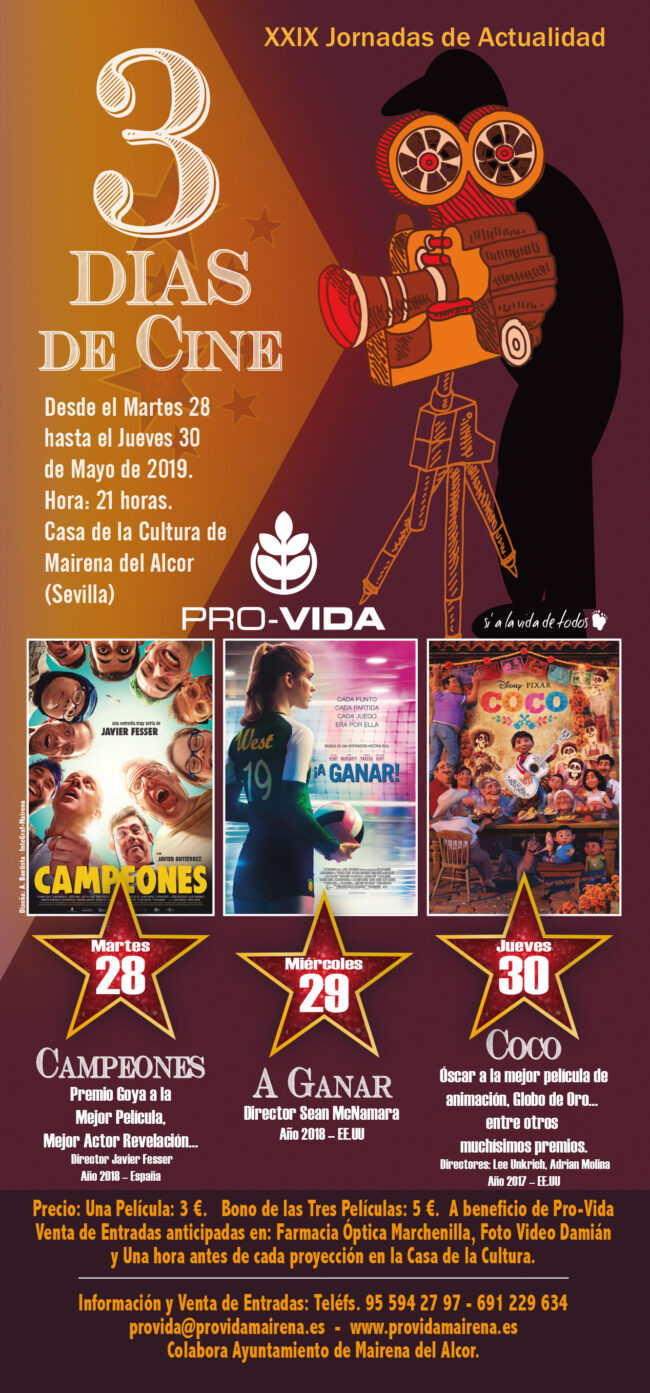 Como es habitual en los últimos años Pro-Vida Mairena del Alcor organiza 3 Días de Cine, en esta ocasión con 3 magníficas películas. Lo recaudado, una vez abonados los gastos, irá destinado a costear las numerosas actividades de difusión que lleva a cabo la Asociación, además de a la adquisición de productos de primera necesidad…