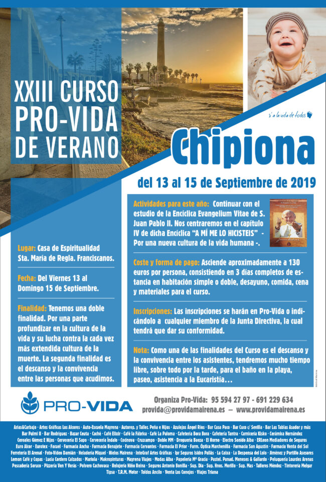 Lugar: Casa de Espiritualidad Sta. María de Regla. Franciscanos. Fecha: Del Viernes 13 al Domingo 15 de Septiembre. Finalidad: Tenemos una doble finalidad. Por una parte profundizar en la cultura de la vida y su lucha contra la cada vez más extendida cultura de la muerte. La segunda finalidad es el descanso y la convivencia…