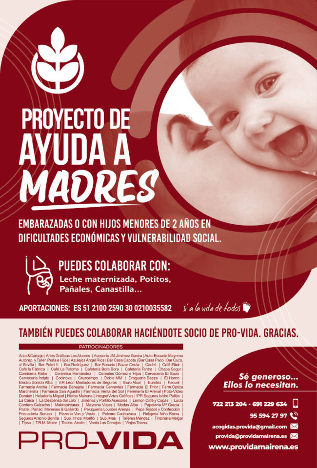El mes de abril, debido al notable aumento de peticiones que hemos tenido y estamos teniendo, ha sido especialmente intenso en cuanto a las concesiones de ayudas realizadas por nuestra Asociación Pro-Vida de Mairena del Alcor. Hemos realizado ayudas a madres de Mairena del Alcor, El Viso del Alcor, Alcalá de Guadaira, Carmona, Dos Hermanas…